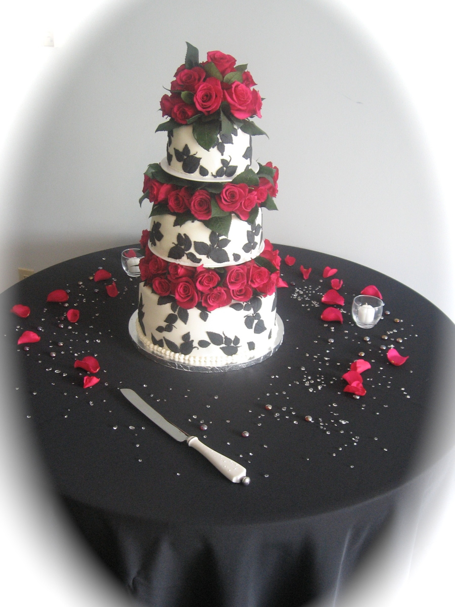 From a Martha Stewart design the bride found and loved. We changed it a little to incorporate two rose tiers and topper. White fondant covers three tiers and black fondant rose-leaf cutouts.
