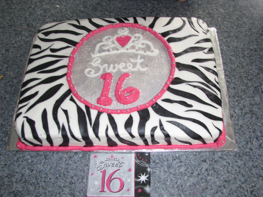 This is a cake I made for my cousins Sweet 16. It's half chocolate, half vanilla, covered and filled with buttercream. She gave me a napkin to work off of and told me she wanted something different and this is what i thought was cool. The zebra stripes are fondant. TFL