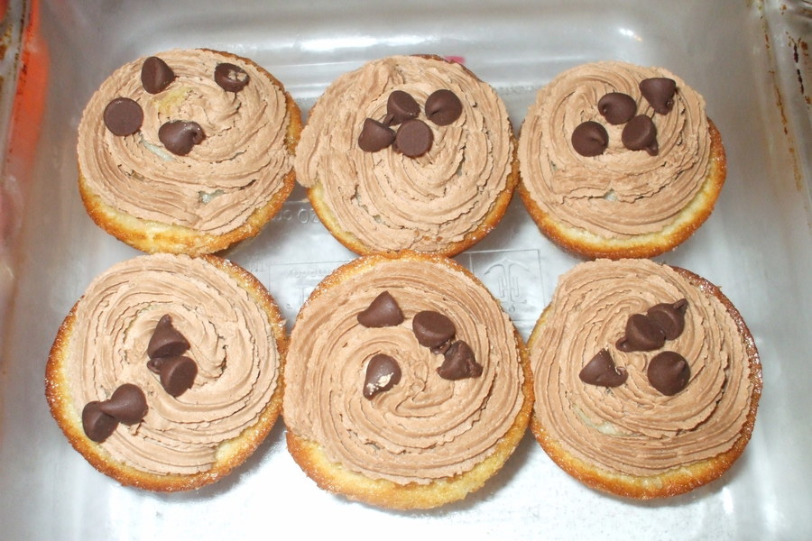 Made for Father's Day. These are the 1st cupcakes I have made 100% from scratch. Also, my first time piping the frosting. They are yellow cake with Wilton's buttercream mixed with melted chocolate and chocolate chips on top.