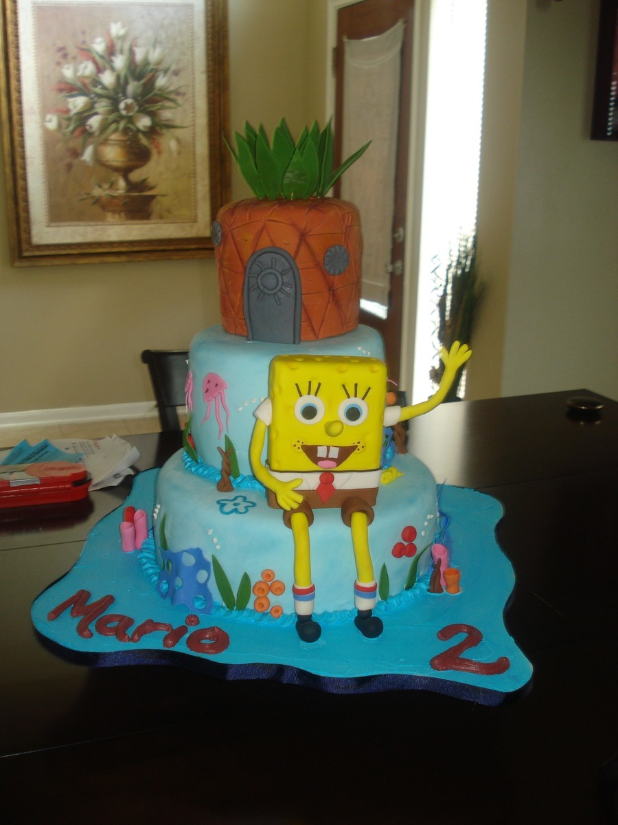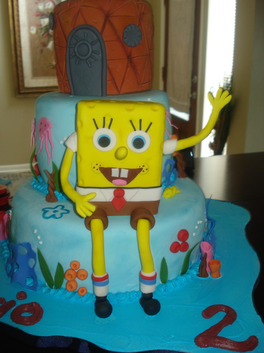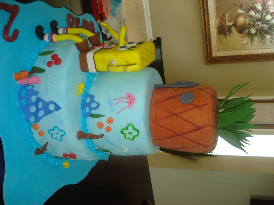 Fondant Cake, Sponge bob is made out of styrofoam. I did not have time to make him out of rice krispies so I made him a week before the cake was due. All decorations around cake are gumpaste.