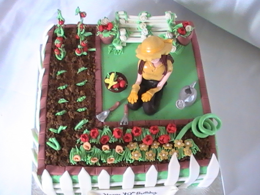 Woman gardening, peas, onions, flowers, gumpaste bench, hose, flower pots, gardeing tools, tomatoes, roses
