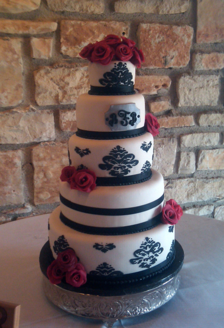 5 tier, white fondant, stenciled with black royal icing to match the couple's invites. All roses are handmade from gumpaste.