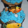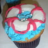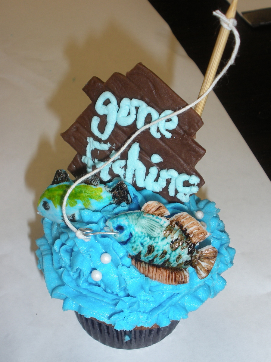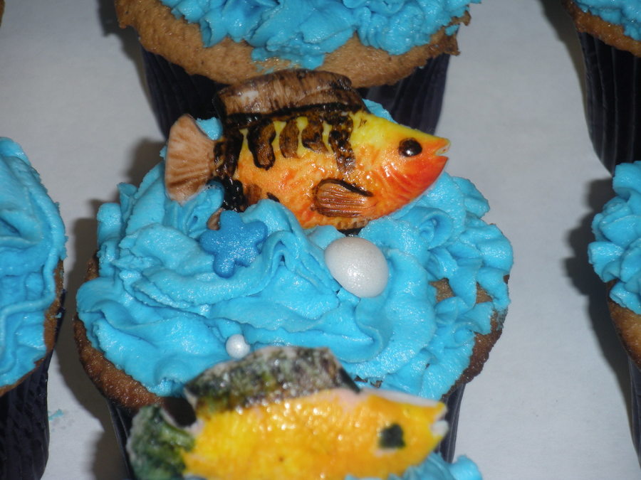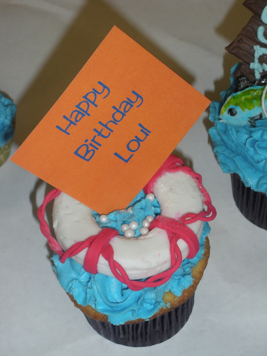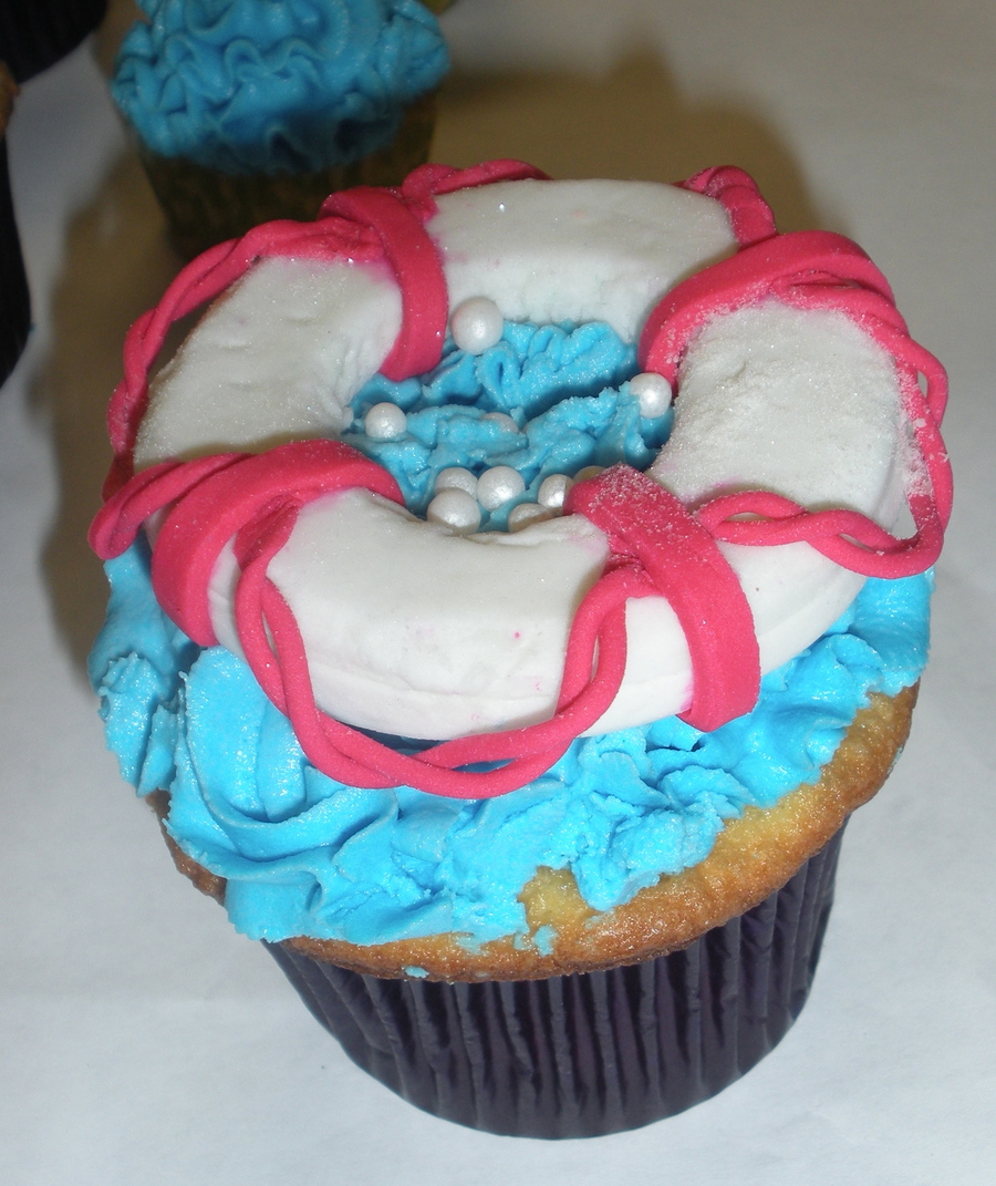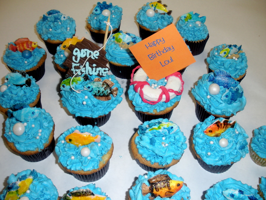 Birthday cupcakes for a fellow co-worker. His past time is fishing. Yellow cake, blue buttercream frosting, gum paste fish, Life preserver.