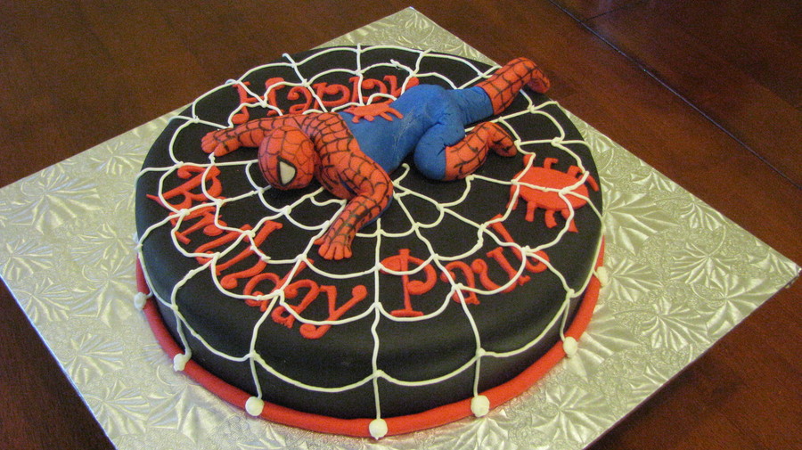 Spiderman made of fondant/gumpaste; spiderweb royal icing. Fun cake!