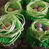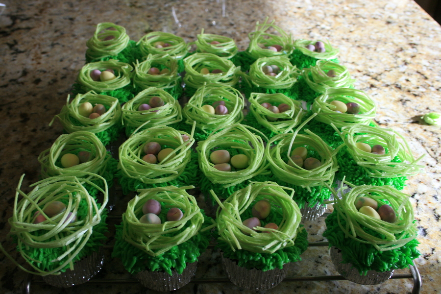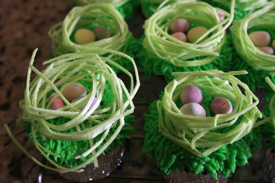 red velvet cupcakes, with cream cheese buttercream for the grass, with sugar nest, and marbleized fondant eggs.