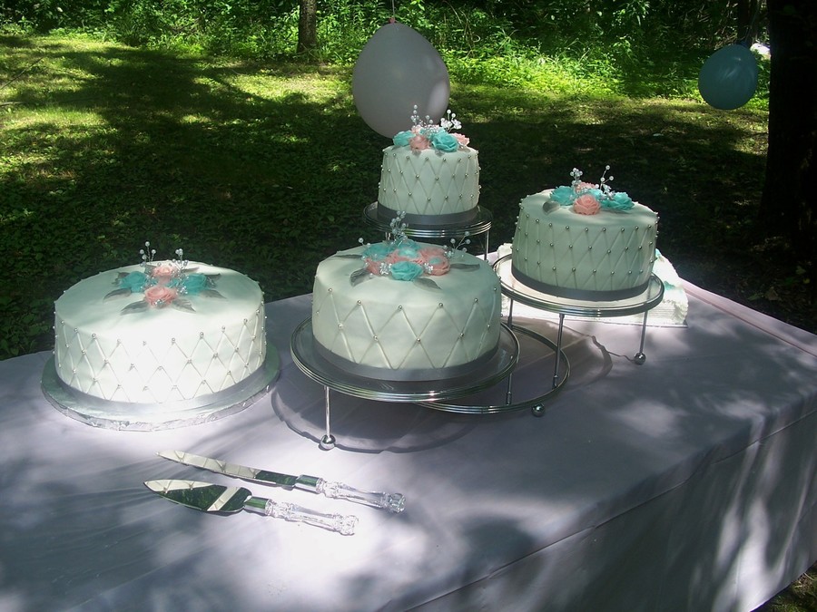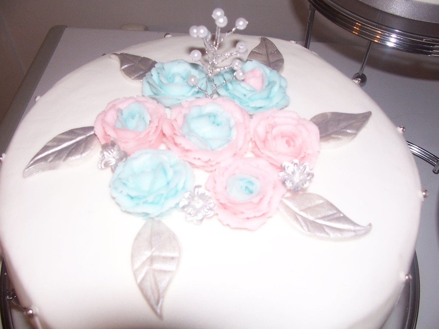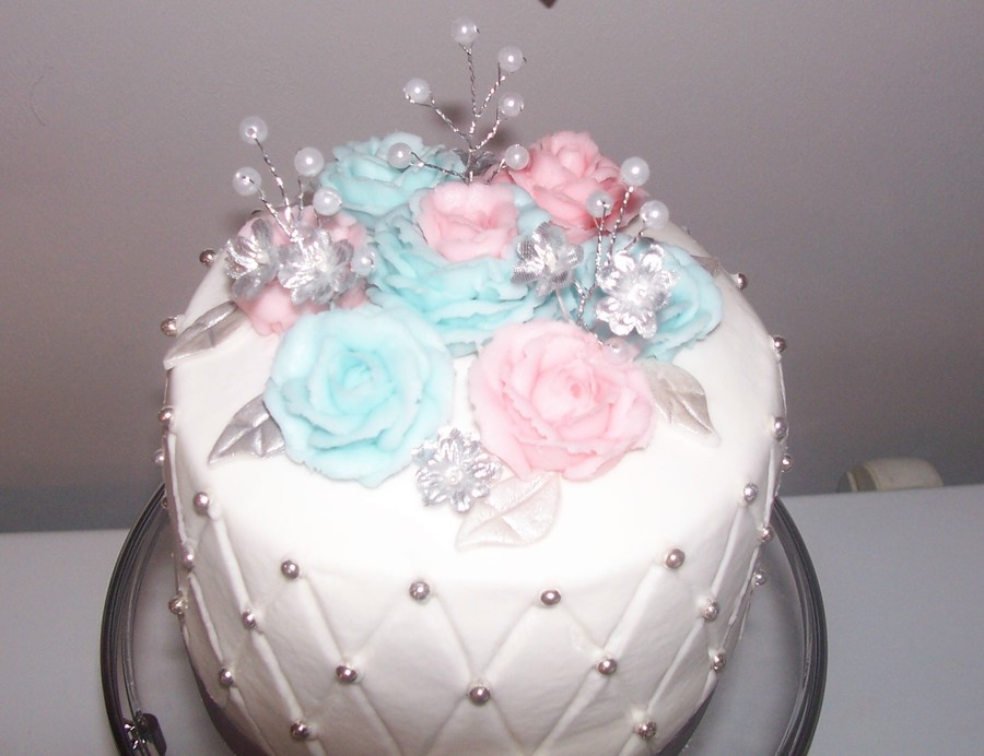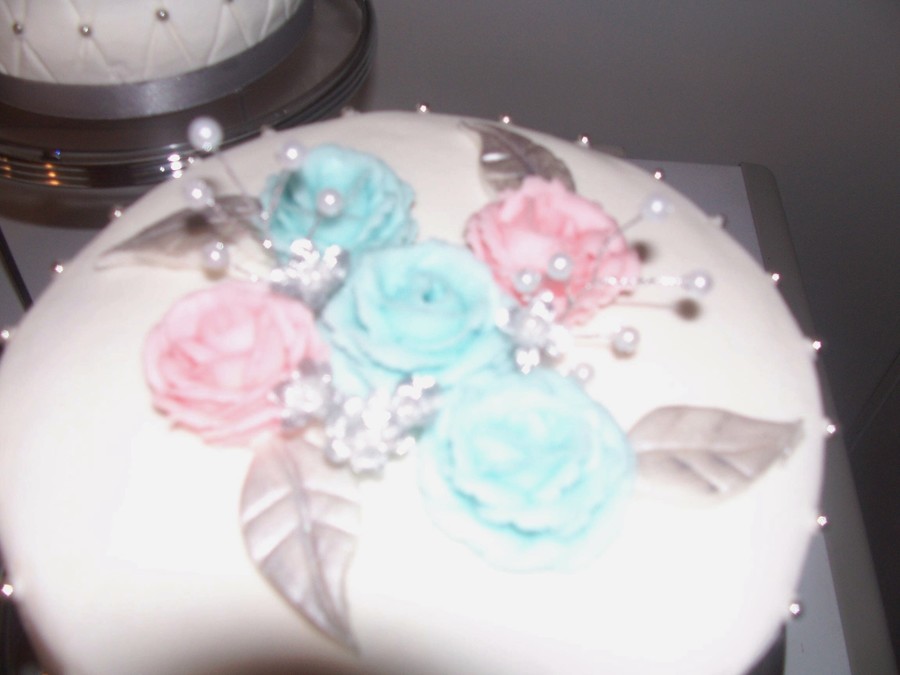 This is a 10" white, 12" chocolate, 8" strawberry, & 6" chocolate cakes. There is also a 9x13 Father's Day/Birthday cake behind the round cakes. The leaves are fondant and roses are icing. Beads and silver flowers are not real. Silver balls are edible.