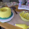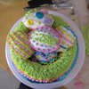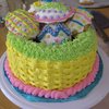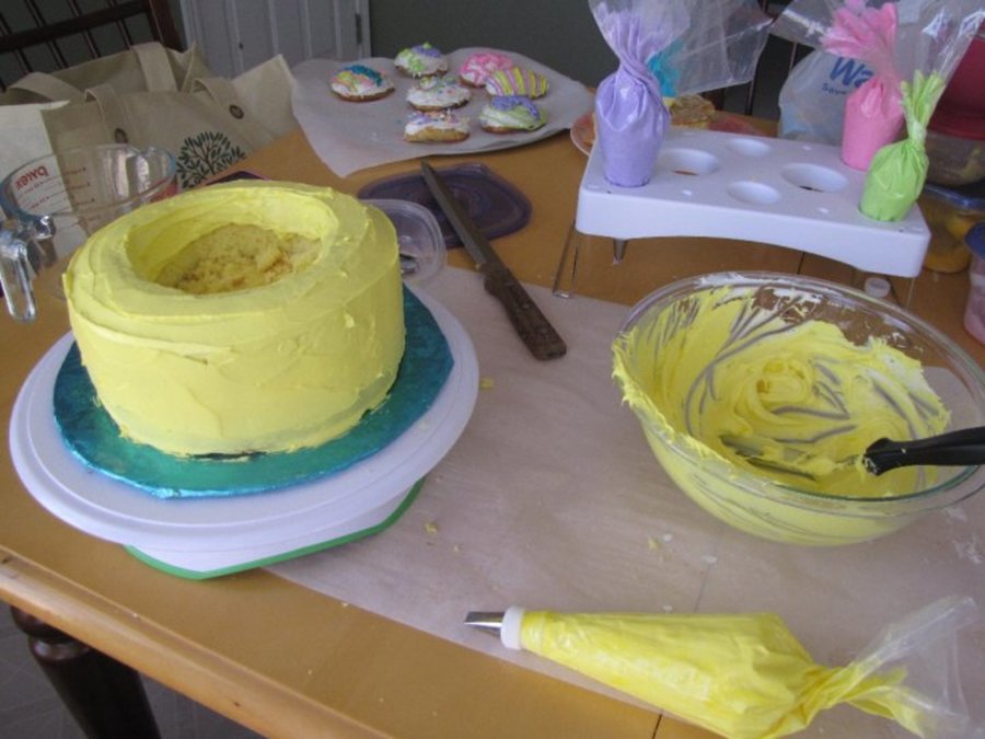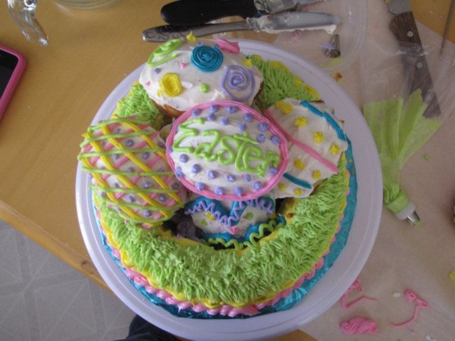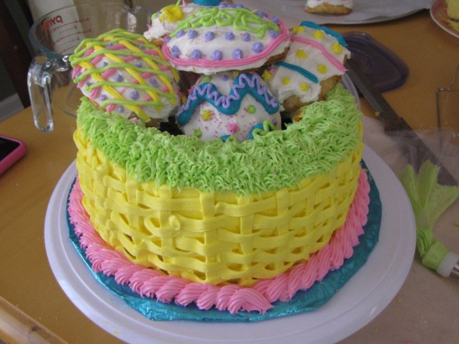 8" 2 layers carved out to fit individual mini egg cakes into "basket"