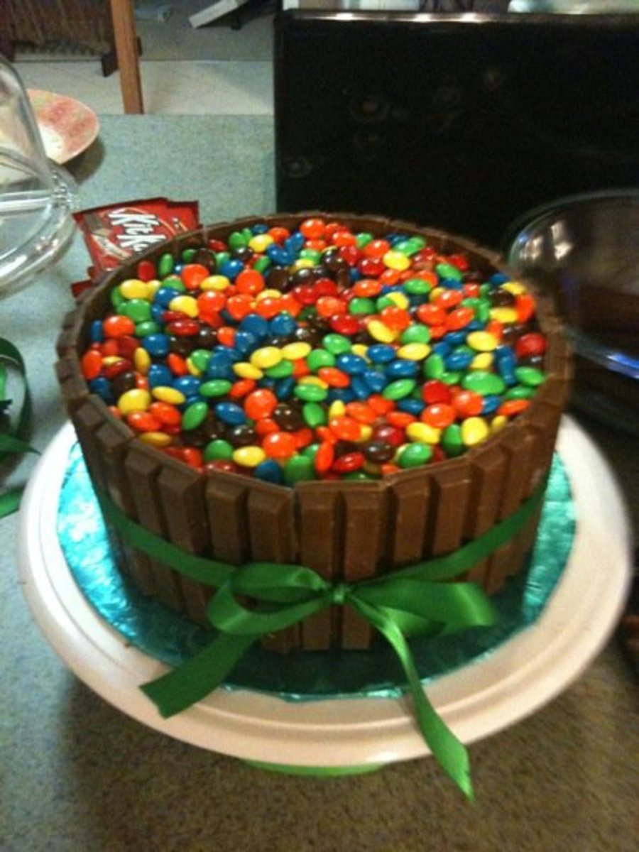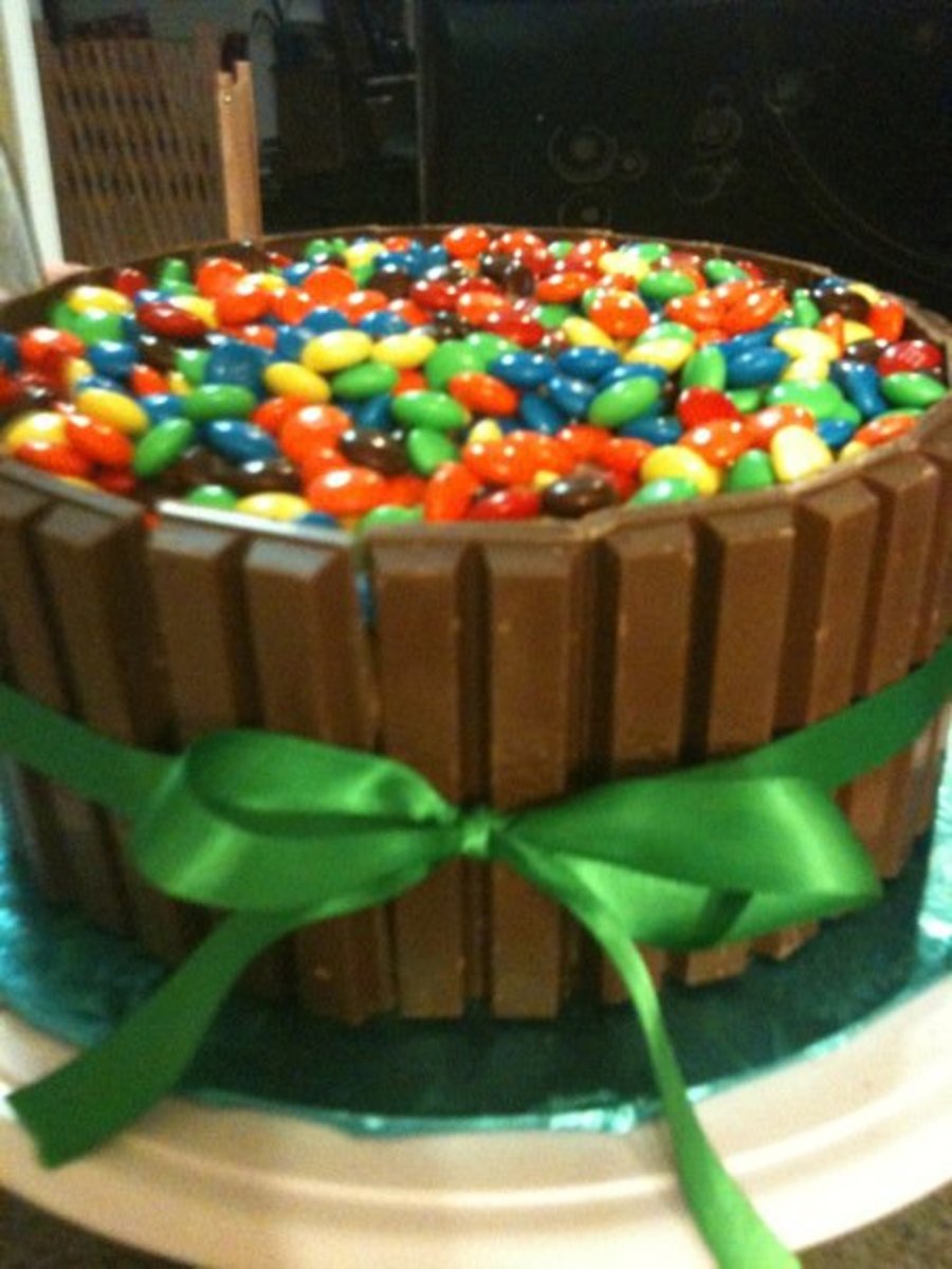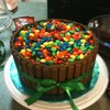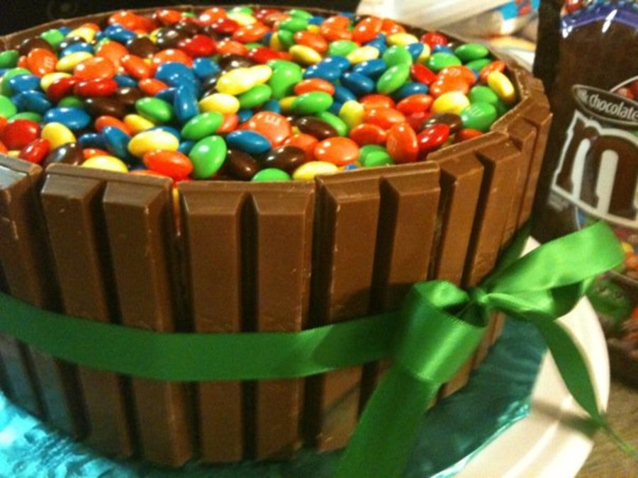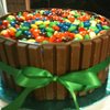 8" cake iced with chocolate frosting, kit kat bars around the sides, filled in with m&m's. This cake has endless possibilites! Don't forget to use a ribbon!