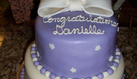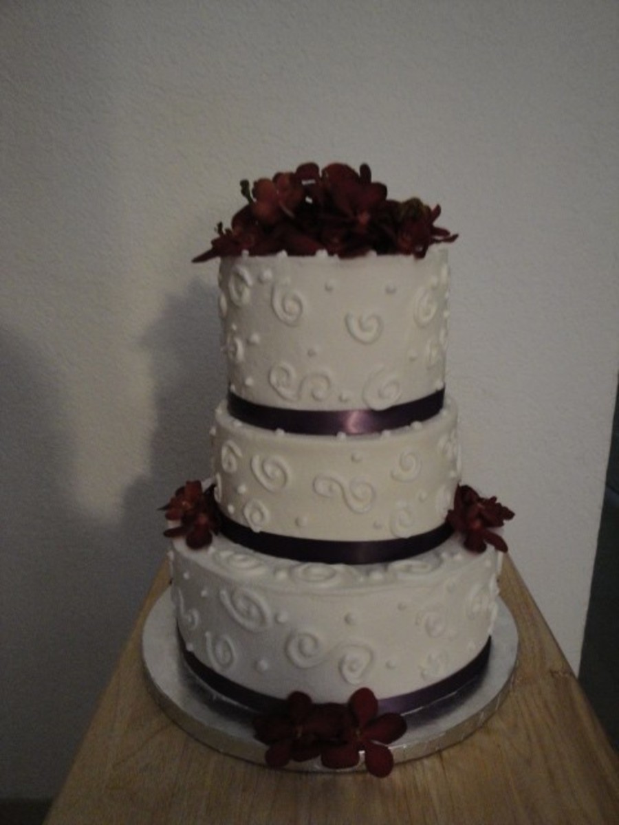 This is actually only one tier of cake. The other two are dummy cakes because there were not many people at the reception. It is covered in buttercream w/ swirl accents and ribbon and real flowers.
