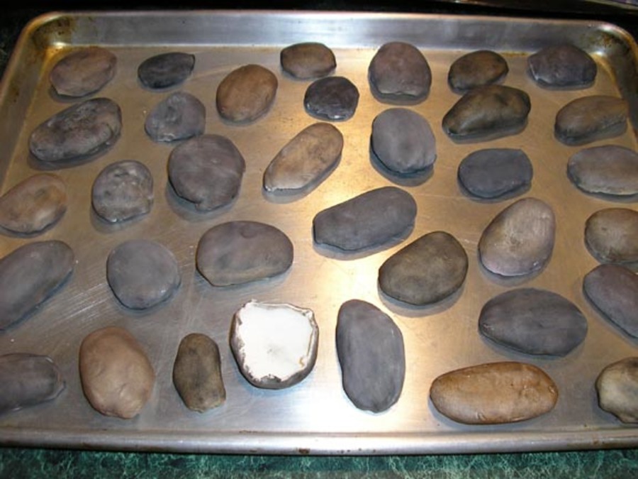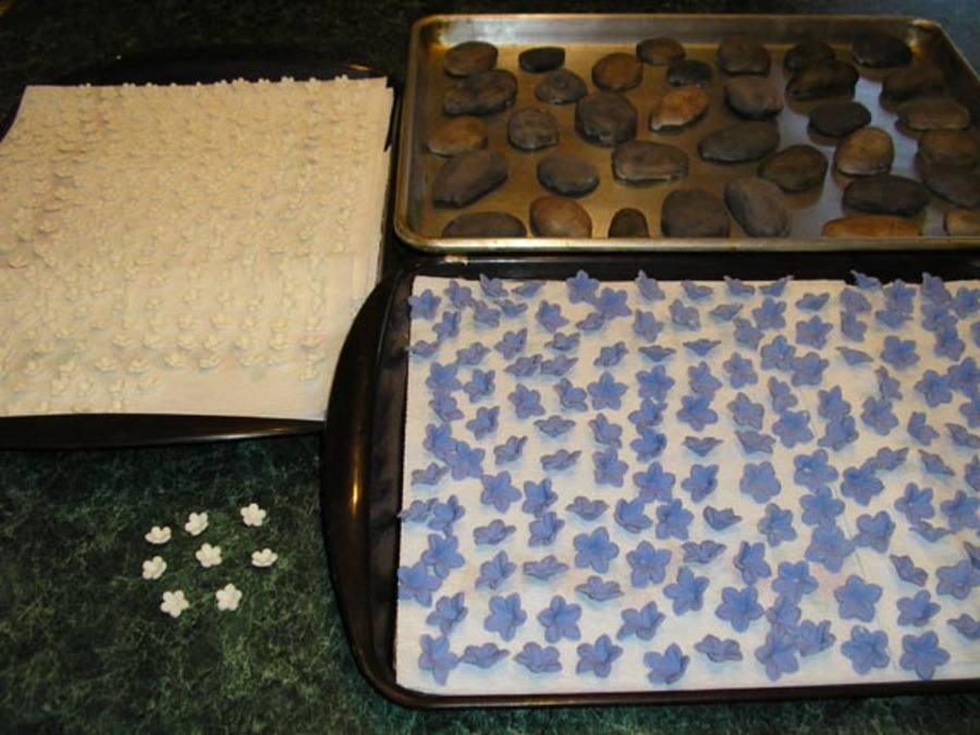 They look real, don't they? They are made from Mexican Paste and dusted with six various colors of petal dust. I made them for a friend who is using them on a cake next month. They are made over real river rocks and are LOTS of fun to do. I flipped one over in the front so you can see what the underneath looks like. The other picture is the hundreds of fondant blossoms I made as well for this cake. She's planning on stacking the rocks against one another sprinkled with blossoms. I think it will be awesome!! Thanks for looking! :D