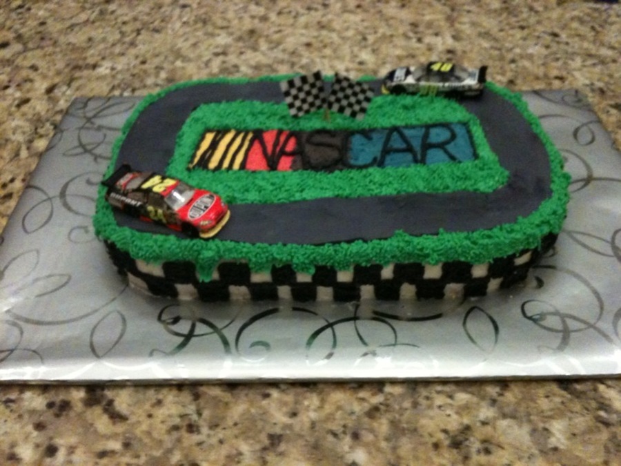 My first NASCAR cake. Wasn't to bad for an ameteur!! All BC except track was fondant. Cars and flags are not edible. TFL