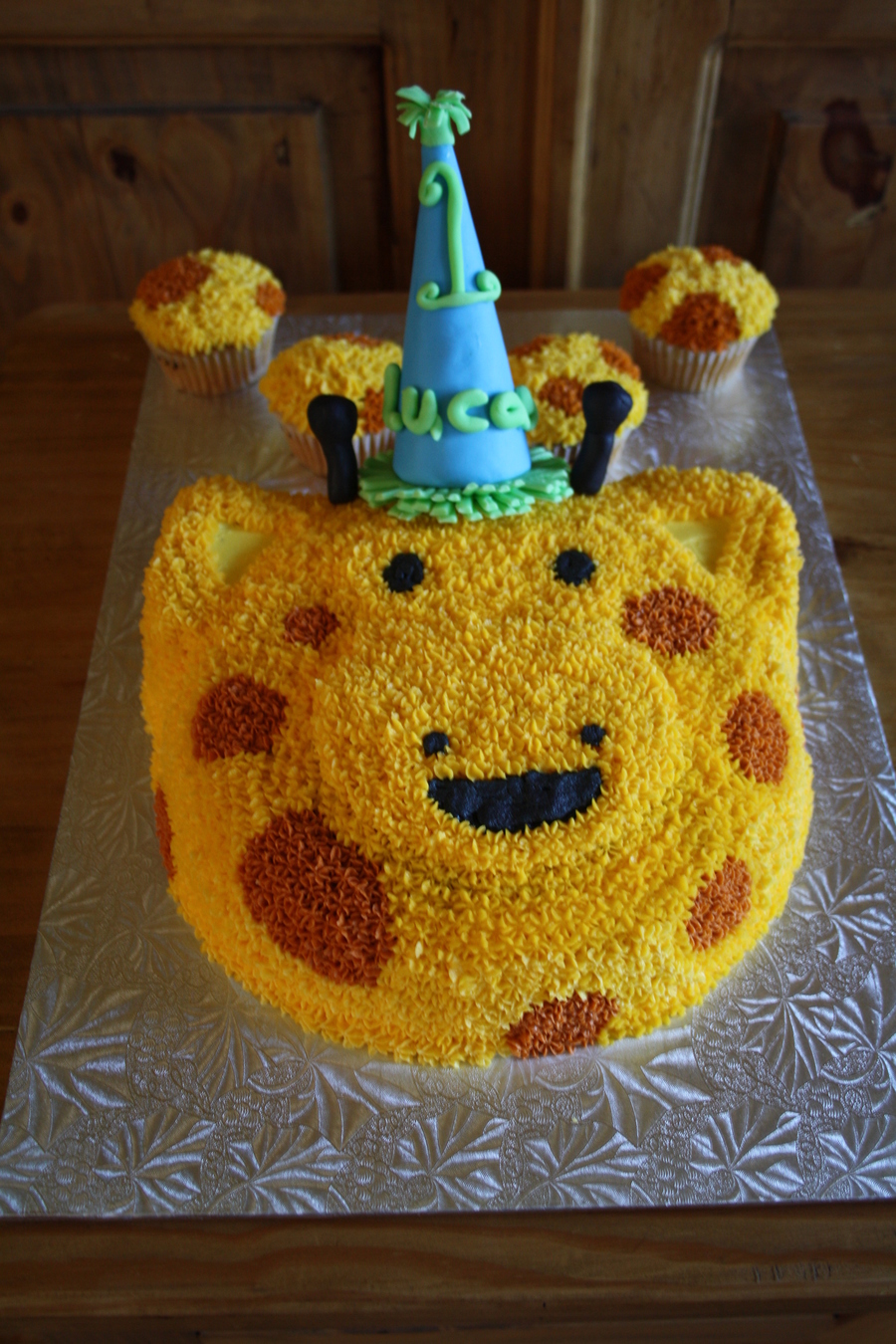 Character bear face cake decorated as a giraffe, sugar waffle cone used for the hat covered with MFF. Made cupcakes with buttercream icing decorated in giraffe print.