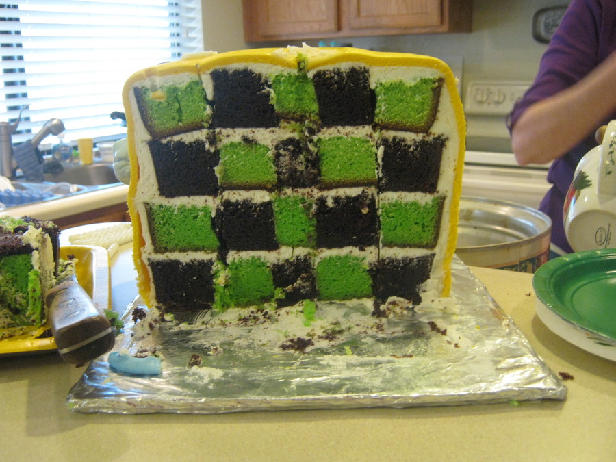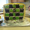 I made this for my son's birthday. It's a chocolate and green checkerboard square cake (I think it might have 4 layers) covered in MMF with rice krispie treat accents.