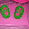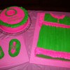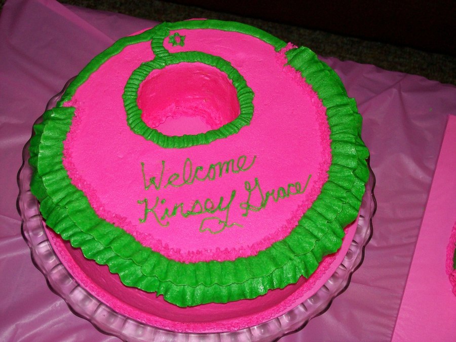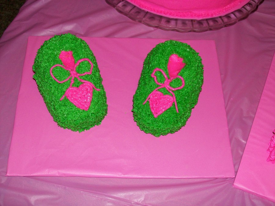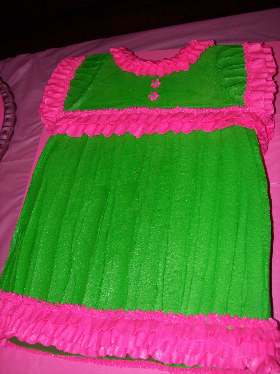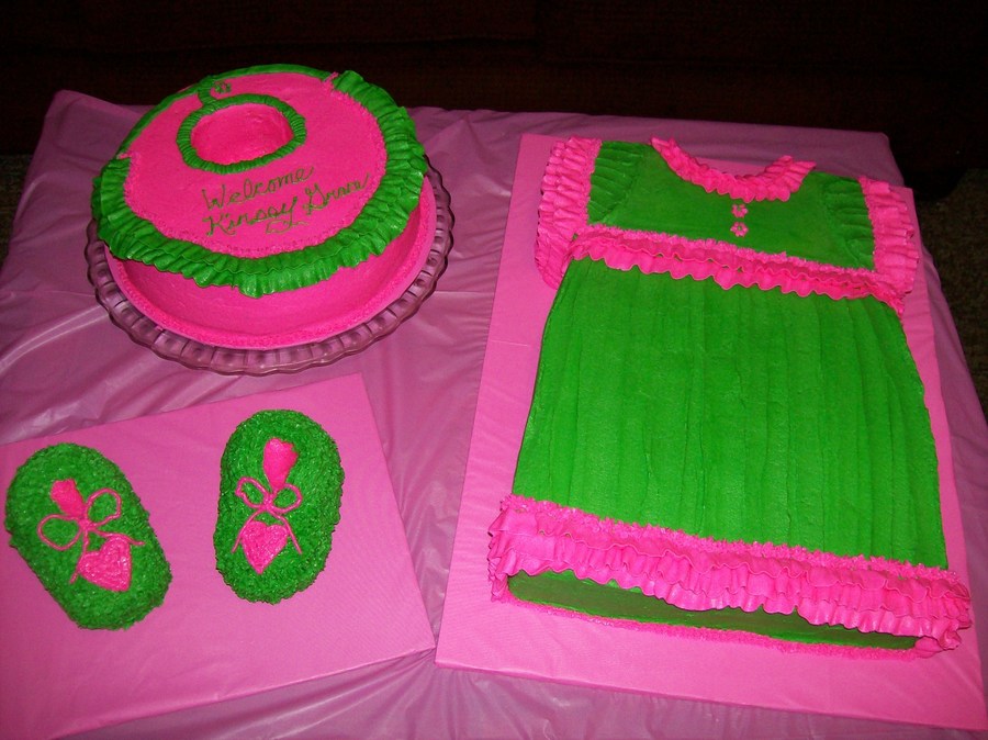 first attempt at a baby dress, made in the mother's choice of colors, lol. French vanilla filled with Italian cream, iced in butter cream. This was done as a gift so I added the bib cake (lemon with lemon cream filling/lemon buttercream) and booties--same flavor as dress cake. This was fun to make, though I did learn somethings "not" to do.