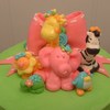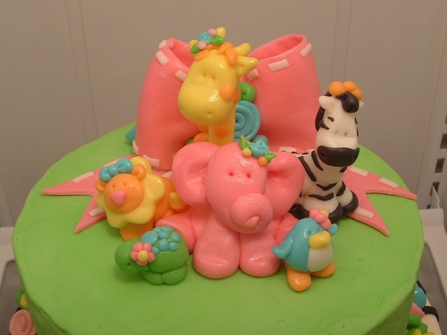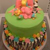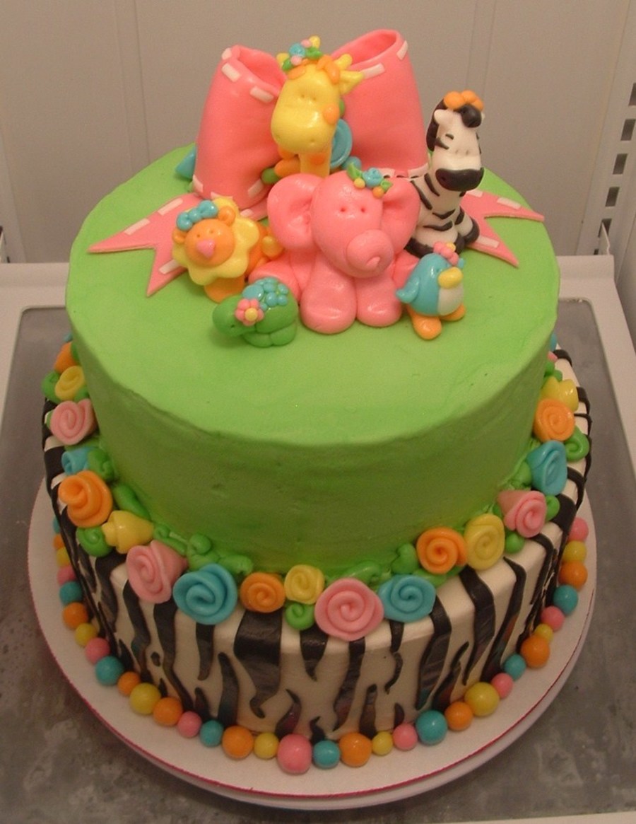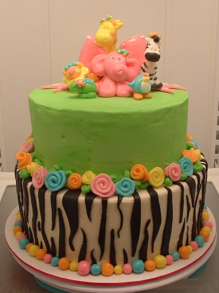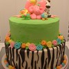 10 inch tier (zebra) of alternating chocolate and vanilla cake with vanilla butter cream and fondant stripes. 8 inch tier (green) of vanilla cake dyed pink, purple and blue. Frosted in green butter cream. All the flowers, animals, stripes. bow and balls are fondant. Thanks for looking!