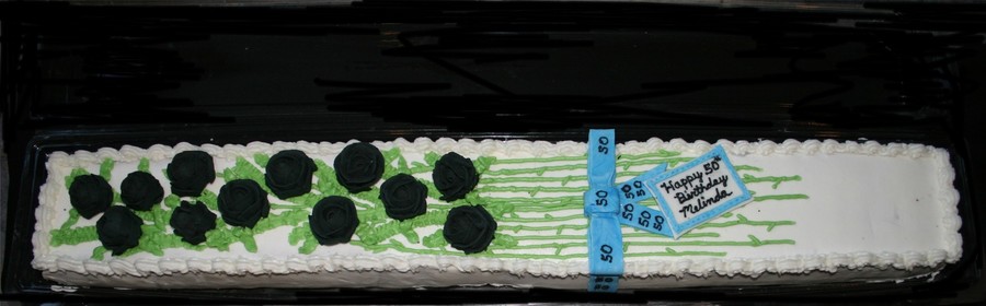 Completed for my sil 50th birthday. My niece said she didn't want anything too mean, but still wanted black on the cake. So, I made black royal icing roses for the first time. Her favorite color is blue so I also added blue gumpaste bow and accented tag in blue. Put the cake in a clear long stemmed rose box from the flower shop.