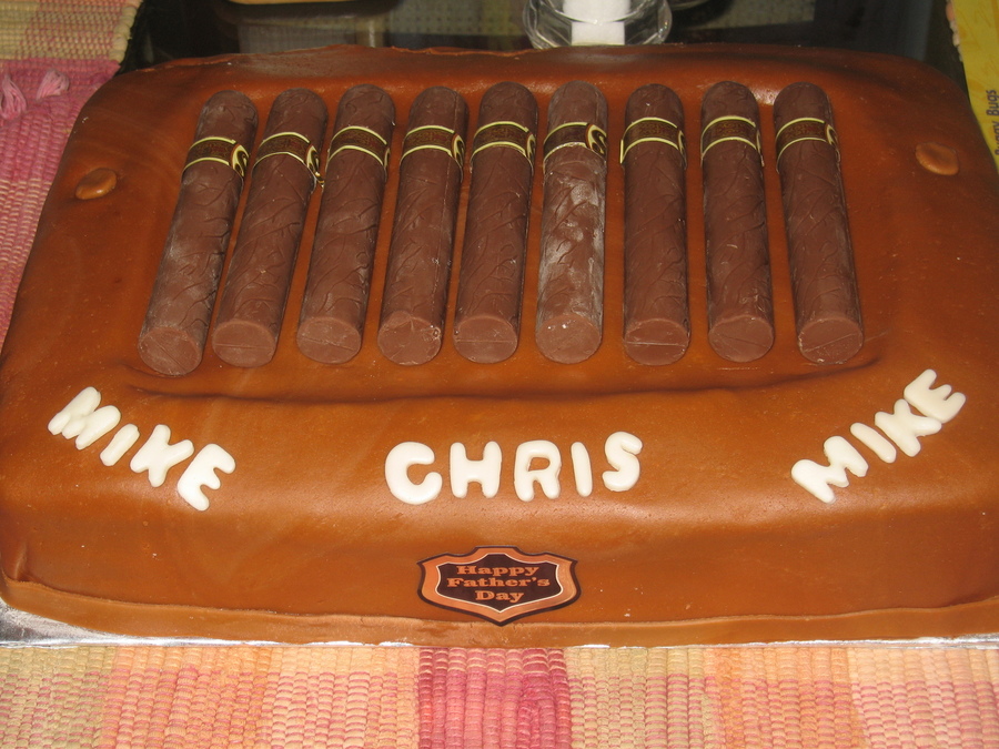 Made this cake for Father's Day, didn't have enough time to finish the lid. :( But they liked it anyway. Orange cake with cream filling, covered in MMF. Cigars are chocolate cigars.