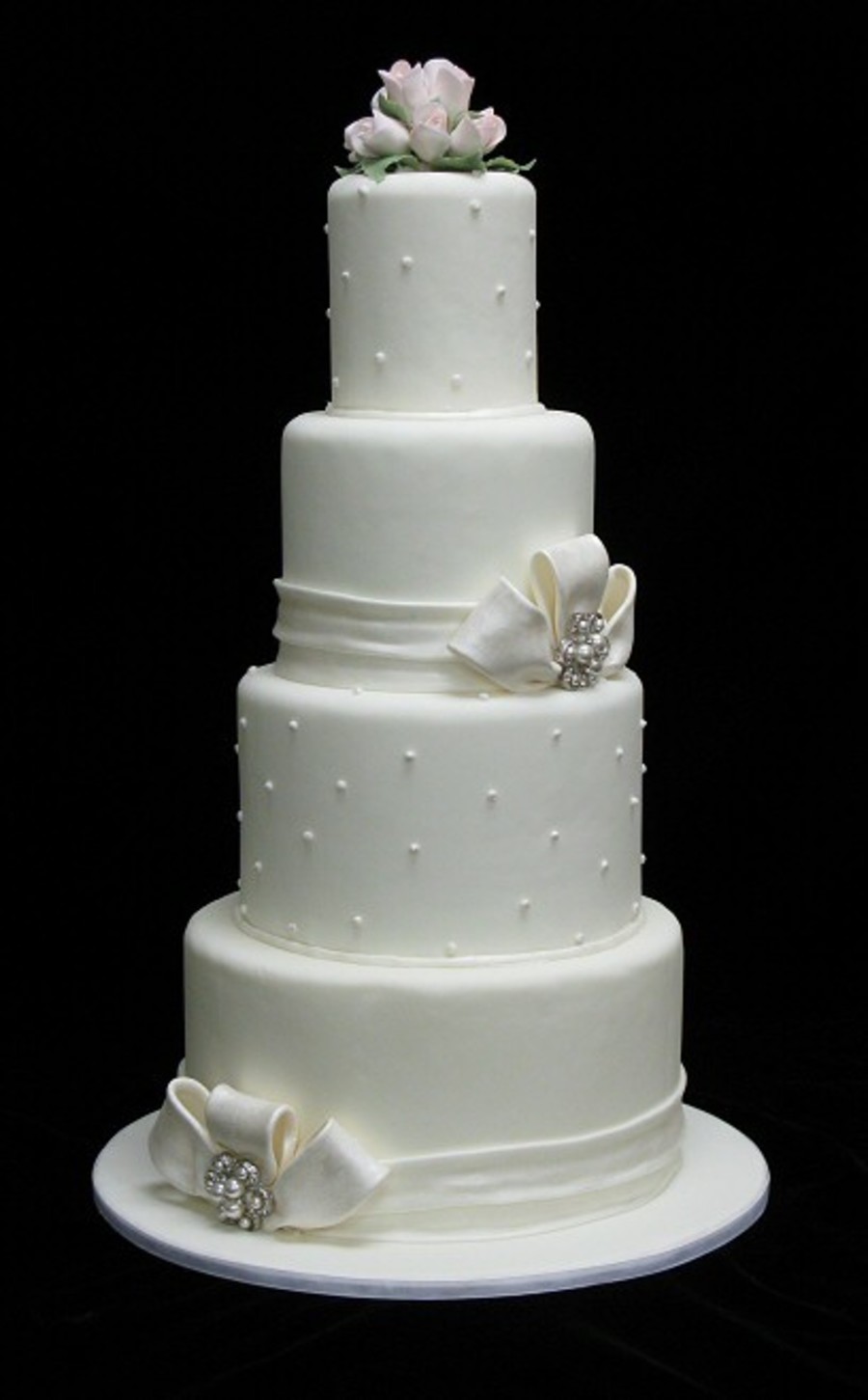 4", 6", 8", 10" dummy covered in fondant with fondant sash and bows. The rose buds are gumpaste and the brooches are real. Thanks for looking!