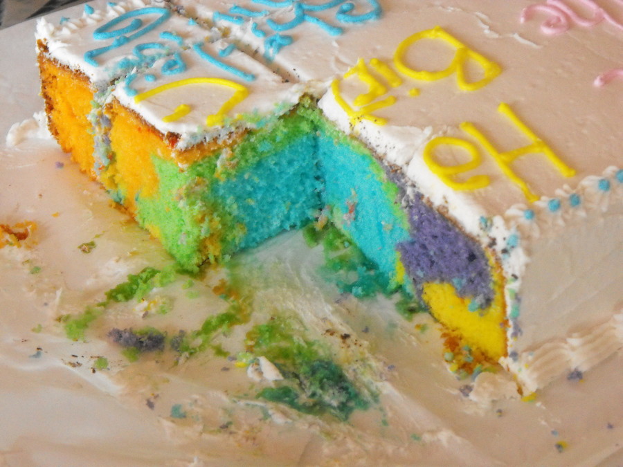 Vanilla sheet cake but rainbow inside. Done in all butter cream.