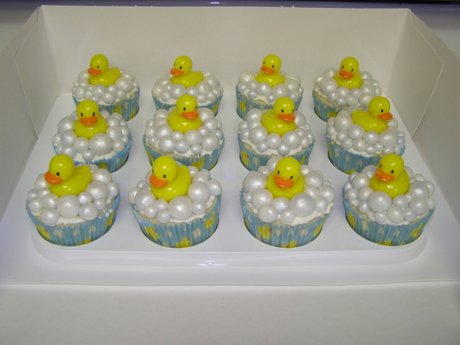 Baby shower cupcakes with fondant "bubbles" painted with luster dust, and plastic ducks.