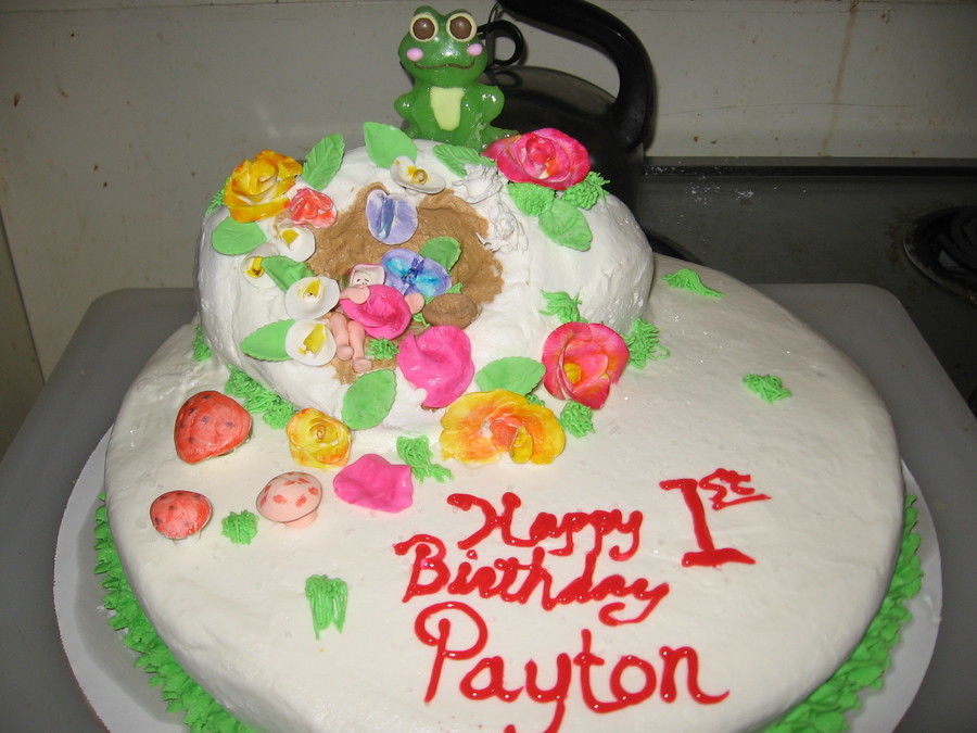 Granddaughters 1st Birthday Cake, hand painted flowers and mushrooms. All made of gum paste, my first attempt. Farie is tucked behind a small rose in the hollow.