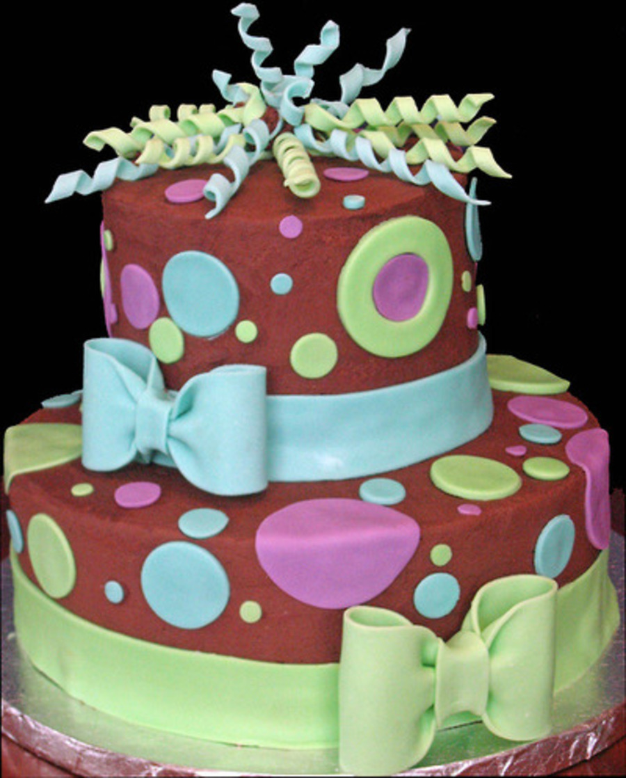 Chocolate buttercream and dots made out of fondant with fondant/gumpaste ribbons and bows.