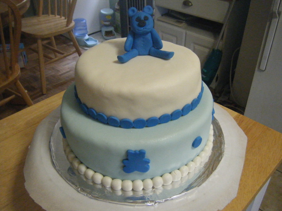 Cake I made for my brother-in-law who is a big teddy bear, hence the theme. The bear is made out of fondant. Cake is covered in fondant as well. Both tiers are vanilla with strawberry filling. It is my first time doing a bear out of fondant :)