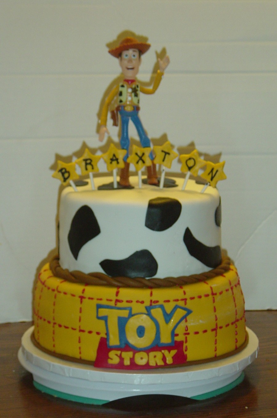 I found a similar cake on CC. Sorry I can't remember who it belonged to so I can give credit. :{ Woody is a bendable figurine that I purchased. My husband drilled holes in his boots and we inserted skewers and drove them into the cake so he would stand.
