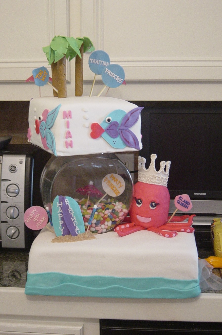 This cake was made for one of my most difficult clients. She always has unique and different ideas for cakes. She wanted something truly original so we came up with this. A fish bowl was used to separate the top cake layer from the bottom. The octopus princess was made with RKT. Everything else is fondant/gumpaste.