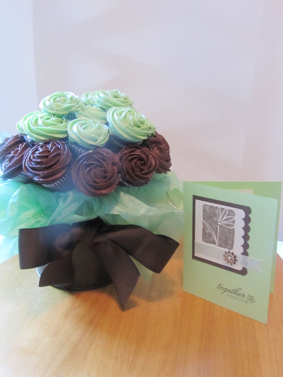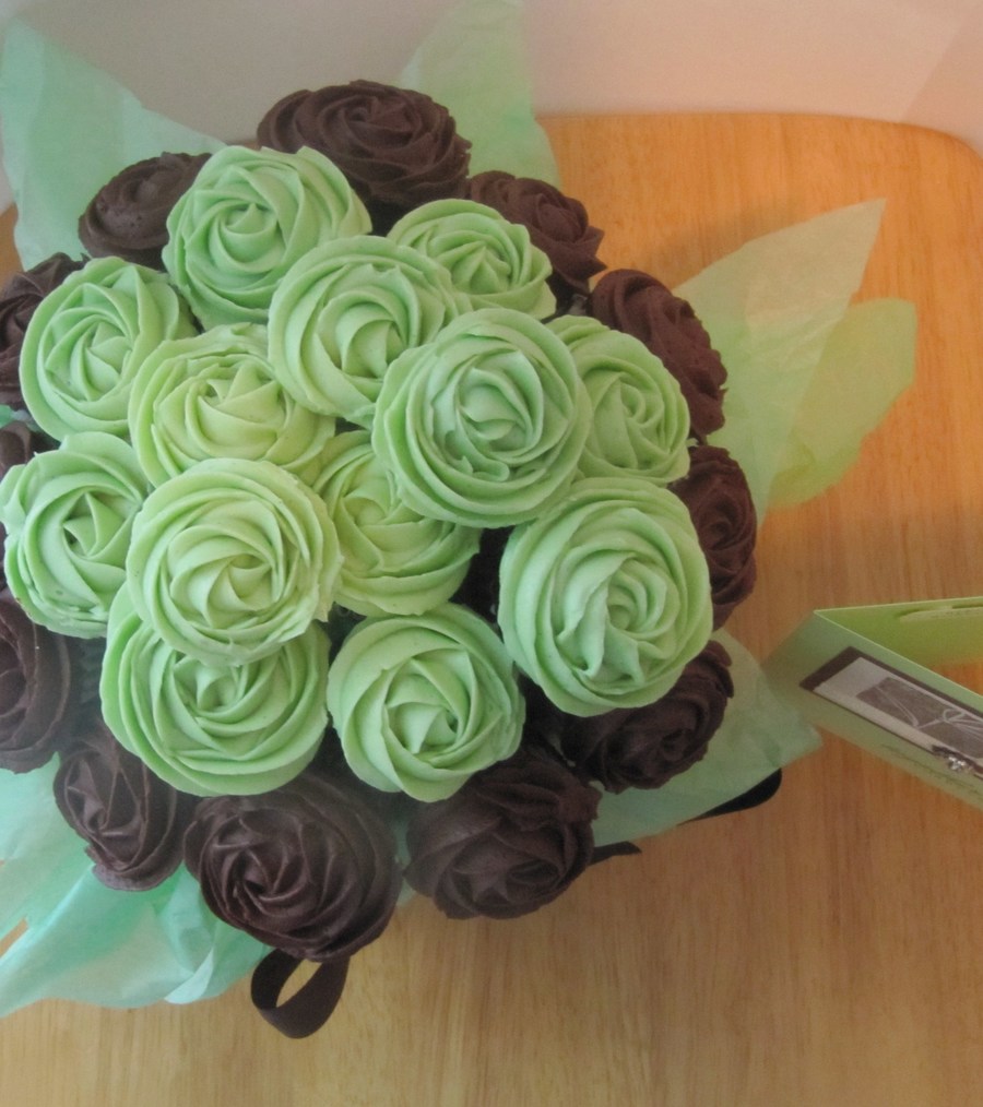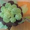 cupcake bouquet for a bridal shower gift to match the wedding colors. Chocolate cupcakes, with dark chocolate frosting & BC (half falvored with coconut other half with orange. TFL