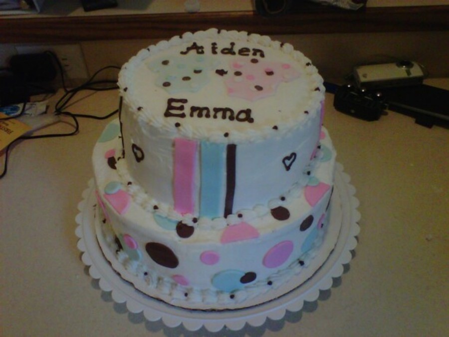 This was my first time making a tiered cake without pillars. It was a little crooked and I wasn't sure how to fix it. It has chocolate cake on top and yellow on the bottom. The icing is buttercream with fondant accents.