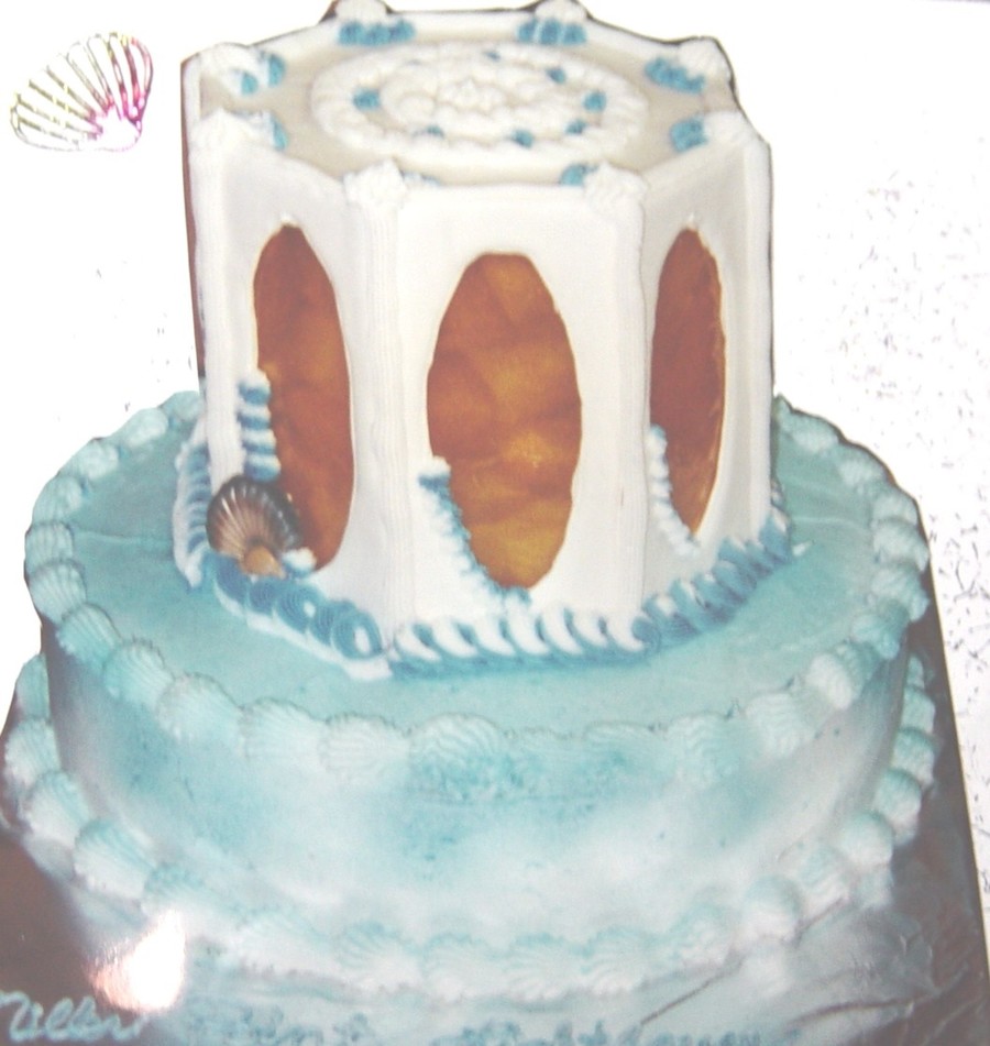 Color flow panels with melted butterscotch candies make up the top of the lighthouse. Inside the hollow topper is a battery powered light. The bottom cake is buttercream. The shells and other decorations are make of fondant as well.