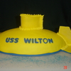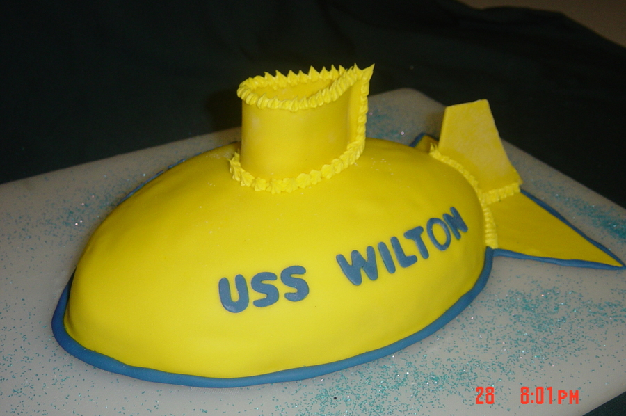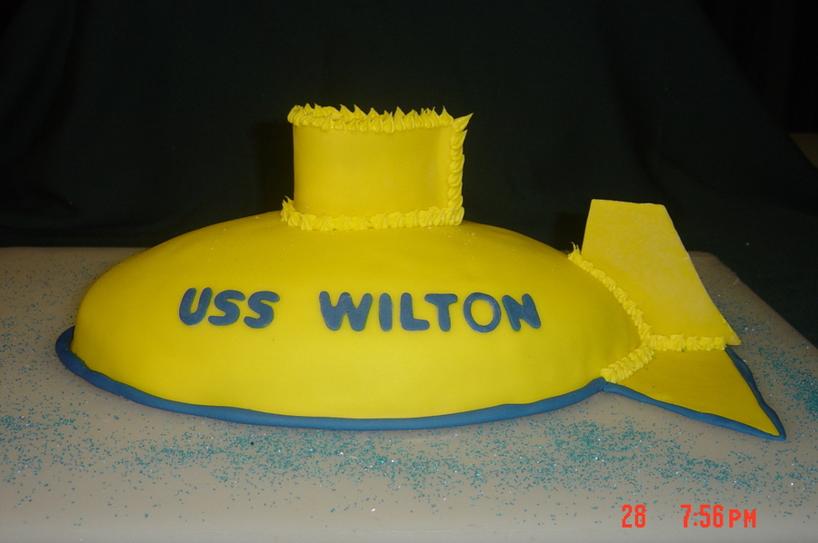 This submarine cake is covered in fondant and formed with the Wilton football shaped pan. The fins are made from dried fondant.