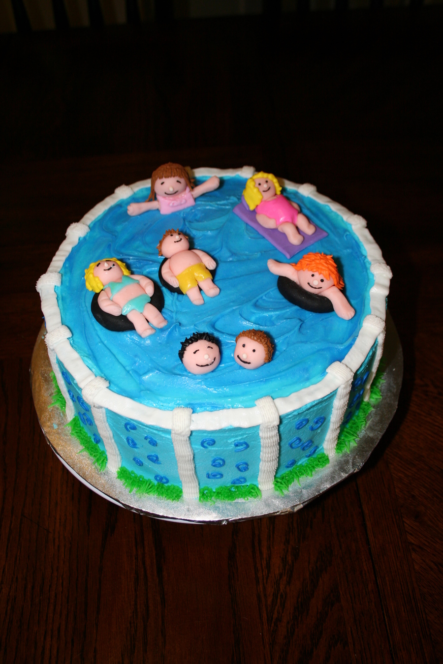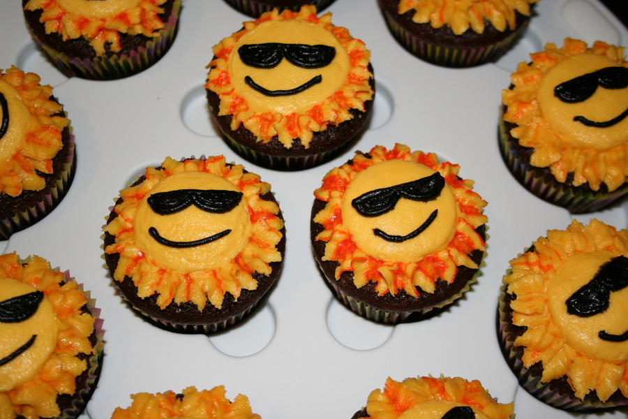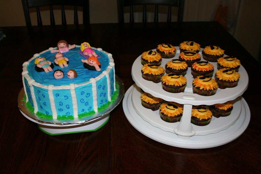 I made this cake and cupcakes for my sister n laws year end school party. I tried to make the people out of royal icing and I think the icing wasnt hard enough because it was melting, so my other sister n law came over and while i was baking and icing all night she was making the people out of fondant! she was my lifesaver otherwise I would have been up all night. I made sunshine cupcakes to match the pool, it just went with the theme. =o)