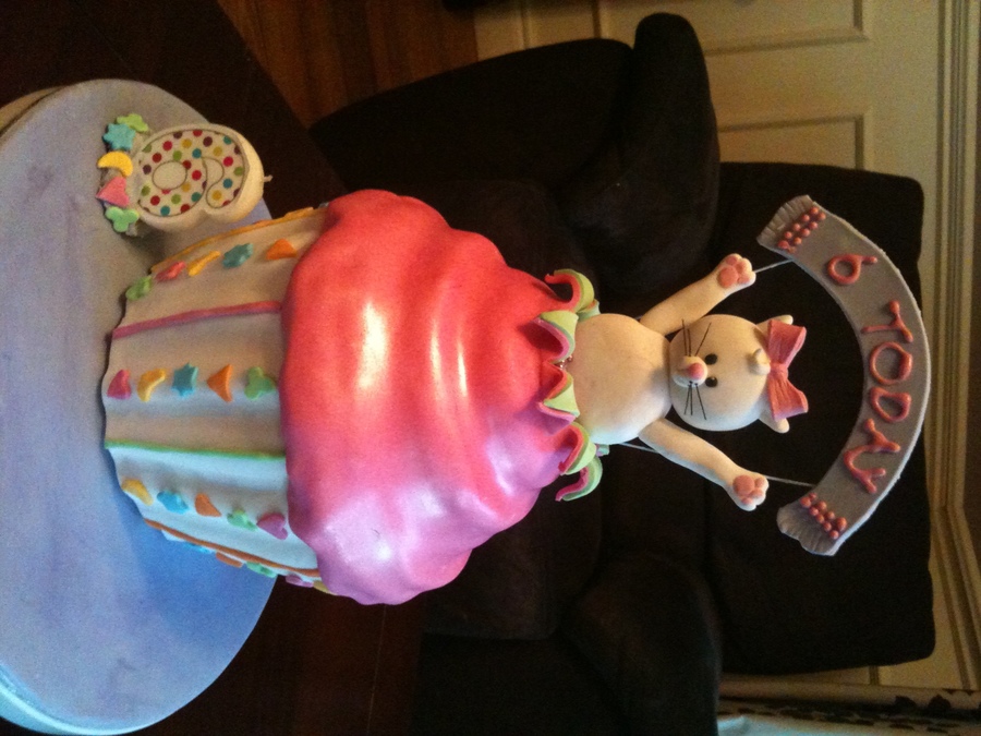My first giant cupcake for a friends little girl, buttercake with buttercream frosting and fondant finish. kitten was made out of modelling paste.