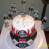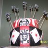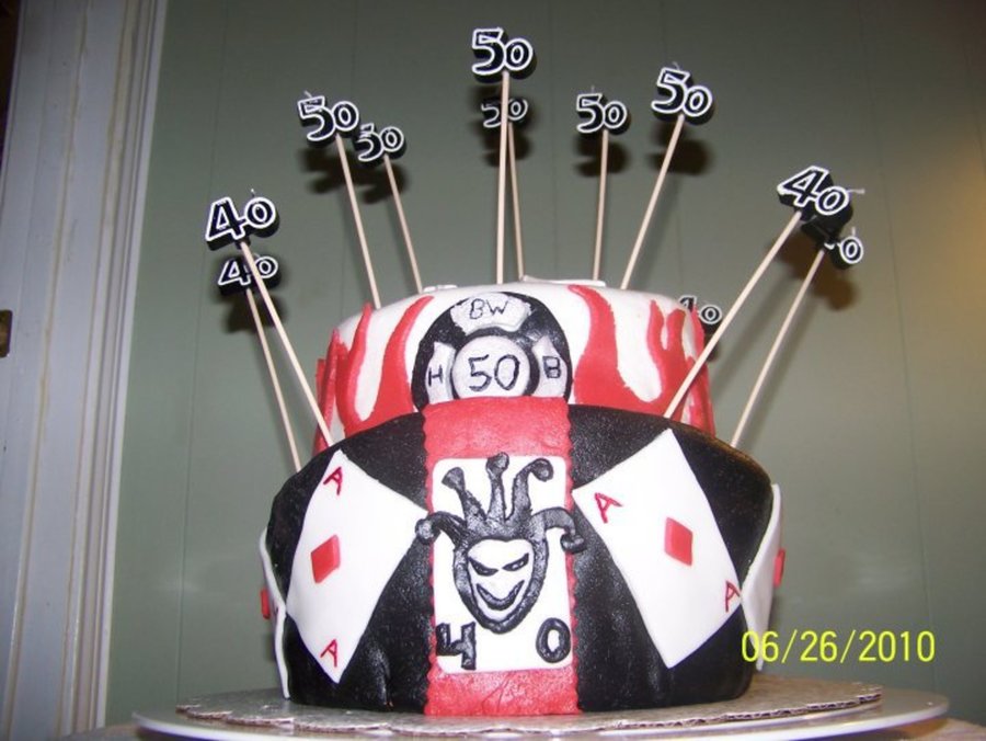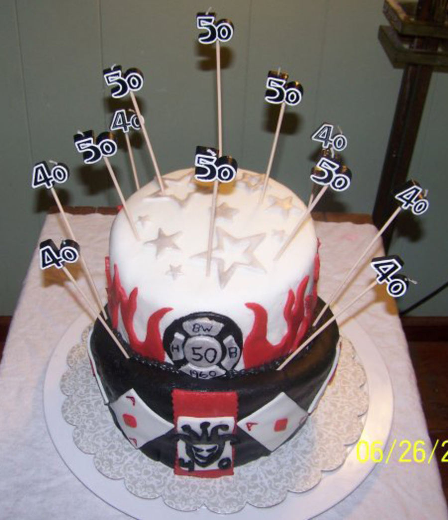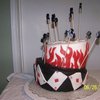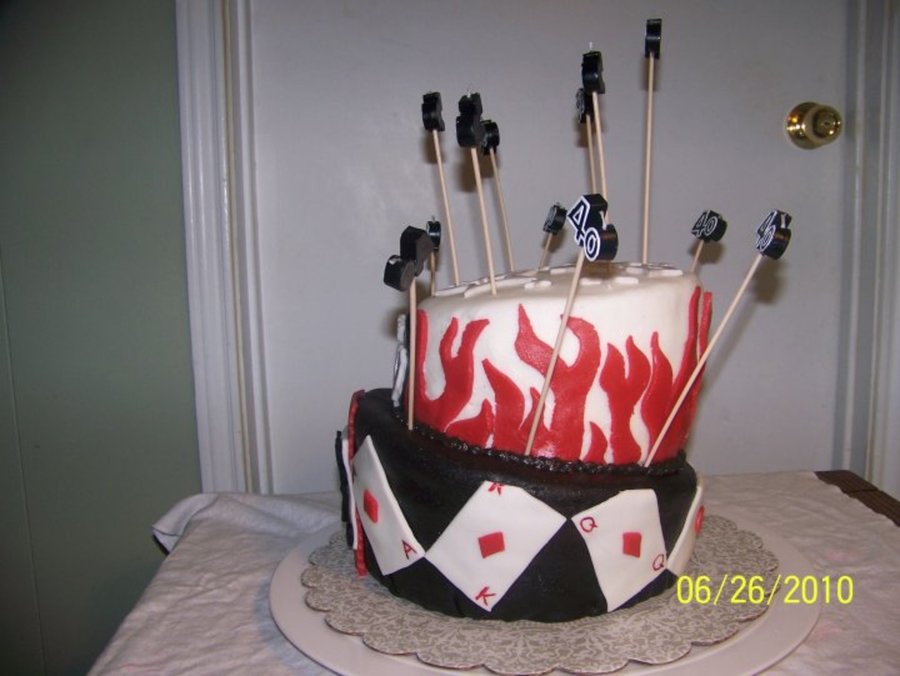 We had a combination birthday party for my husband who was turning 40 and my brother in law who was turning 50. My husband is from Las Vegas and he is quite the joker so that was his theme. My bro-in-law works for the fire department so I did a flaming cake on top with a fireman emblem in the front. This was my 2nd cake made working with fondant. First attempt making a topsy turvy.