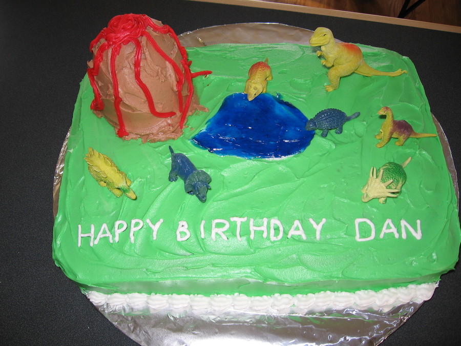 Sheet cake with cared cake mountain. Dino's are toys. Water is blue piping gel.