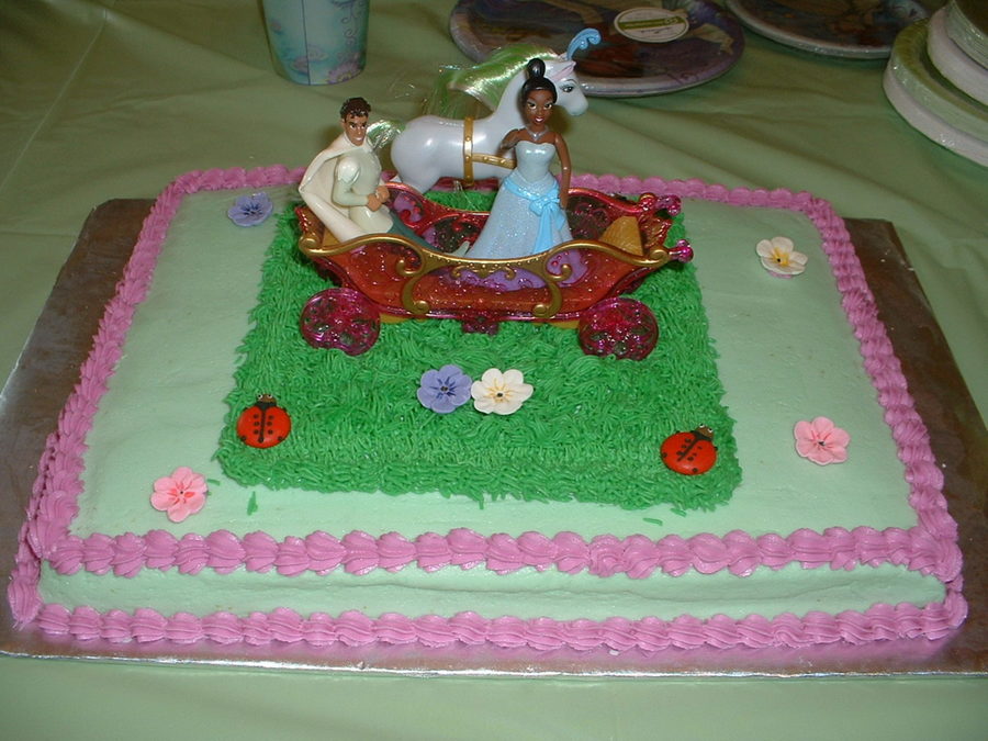 Cake was for my neice's 4th Birthday she wanted a princess and the frog theme. Simple sheet cake with butterceam frosting. Princess and Prince riding in carriage with horse. I used edible drop flowers and lady bugs to decorate the grass.