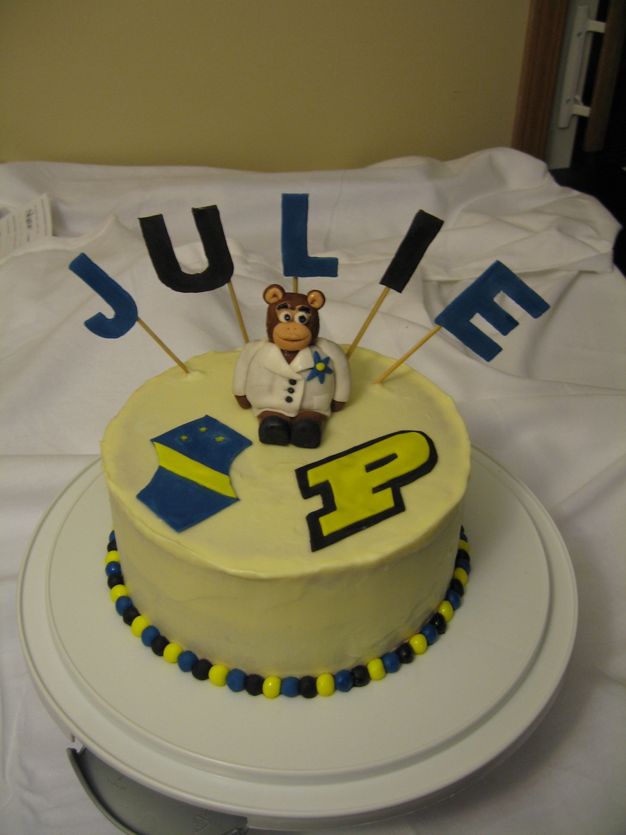 A red velvet cake with white chocolate, cream cheese icing. All decorations are fondant (ball border, letters, Purdue P, AXE symbol, and lab monkey). This was a personalized cake for the birthday of our self-proclaimed lab monkey :)