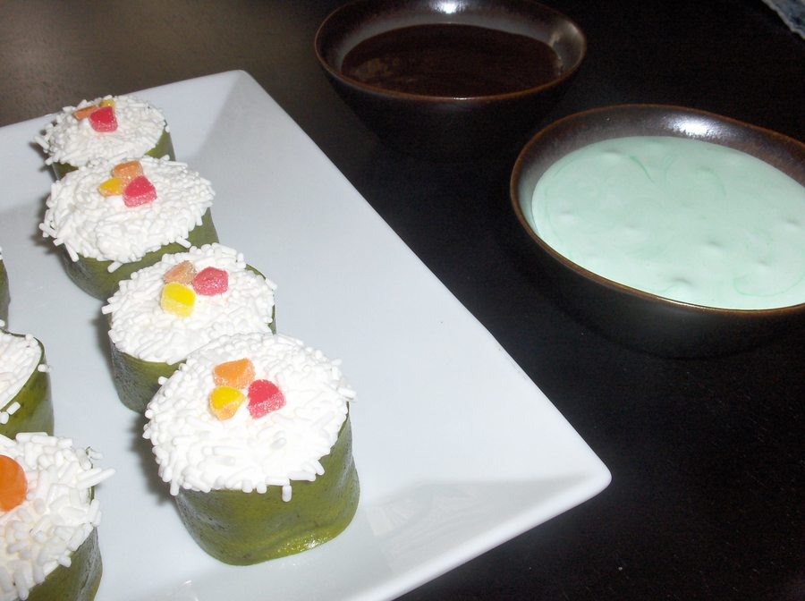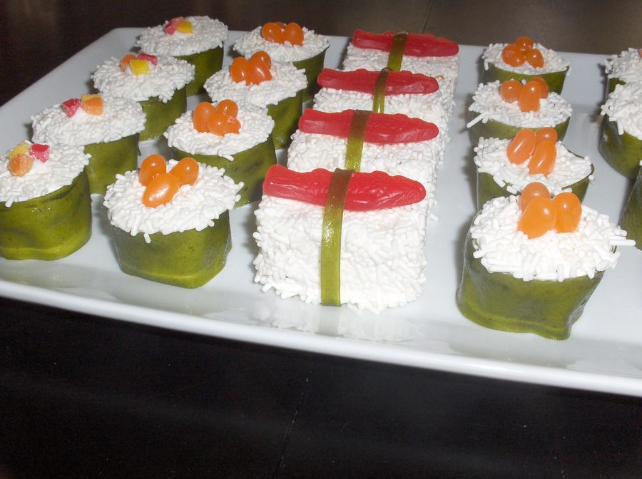Mini Sushi cakes for my brother's birthday. He lived in Japan for 2 years and fell in love with sushi while he was there. Had to put my own twist on it.