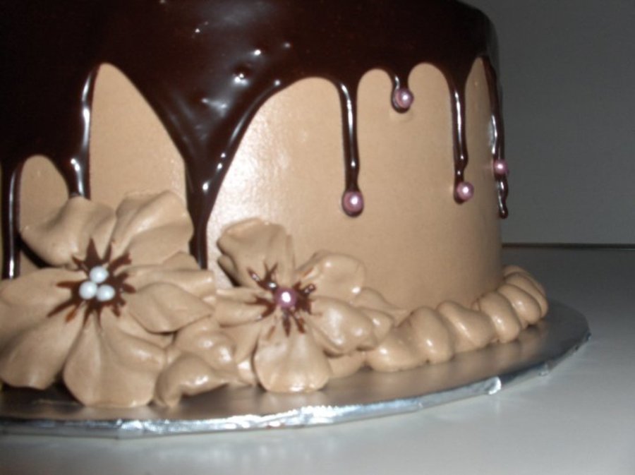 Chocolate cake, chocolate buttercream with dark chocolate ganache. Chocolate buttercream flowers with pink dragee accents.