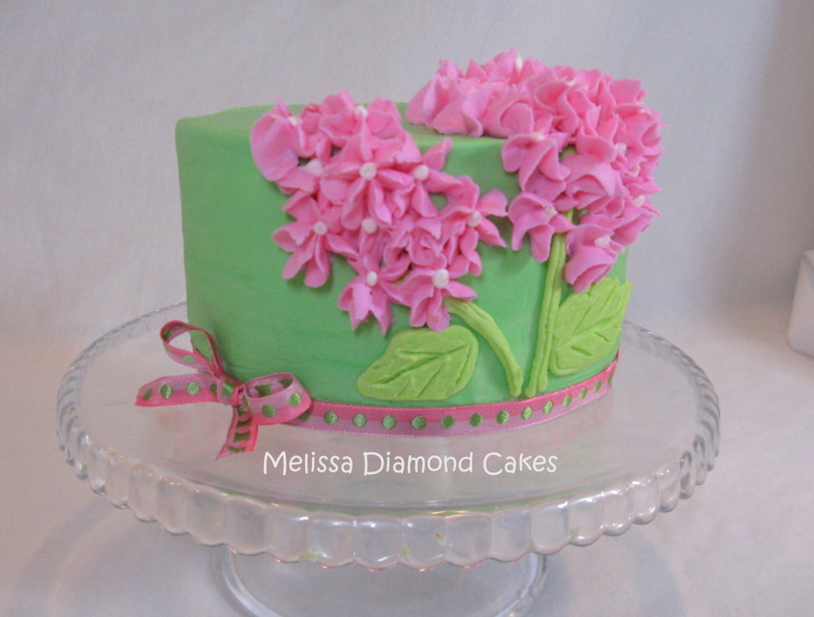 This cake is frosted in buttercream, with buttercream hydrangeas. Thanks for looking!
