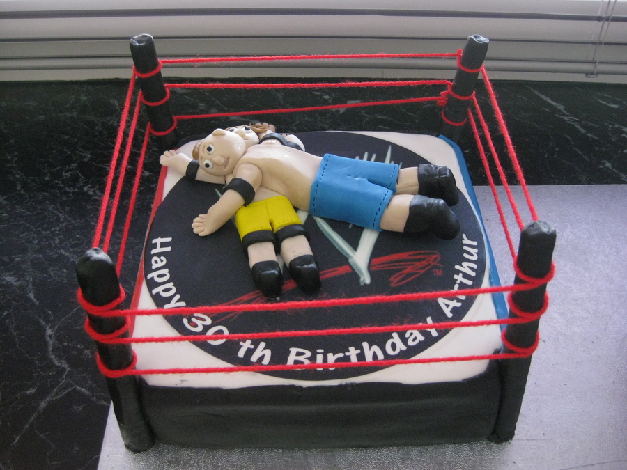 I made a chocolate sponge cake and covered it with Fondant. On top of the ring I put an edible image which was purchased by the customer. I added the wrestlers on top. The poles are made from dowel rods covered with fondant. I used red wool for the ropes.
