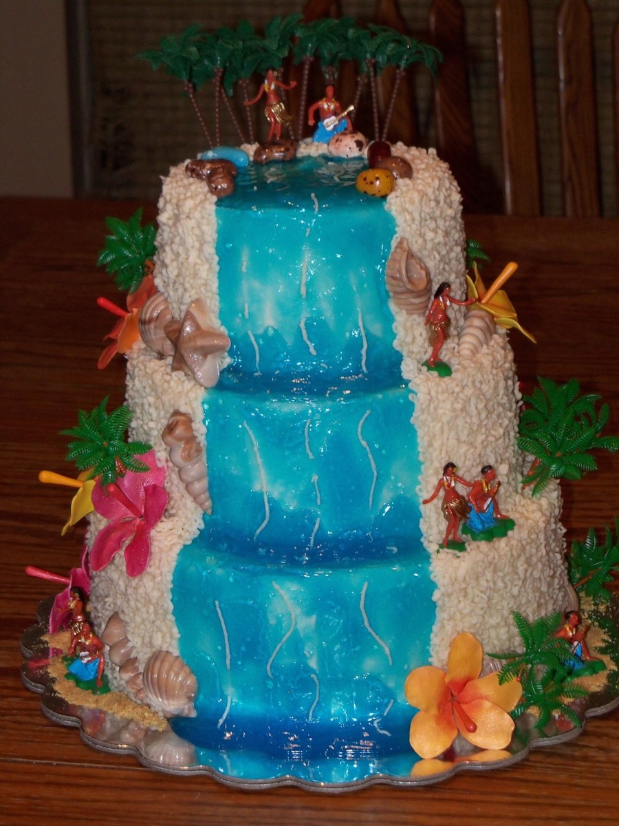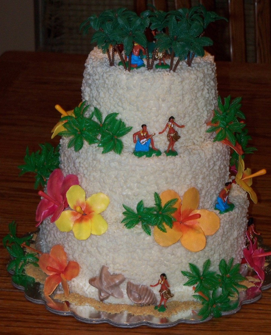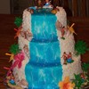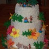 Made this for a 50th birthday. The whole thing is piped with a #2 round tip. This was killer on hands, they hurt for like 3 days afterwards. The flowers are gumpaste, the seashells are chocolate and the trees & hula dancers are plastic. The top tier is lemon cake with raspberry filling, the middle was strawberry cake with strawberry filling and the bottom tier was chocolate with buttercream filling. Made to look like a cake my friend had seen online.