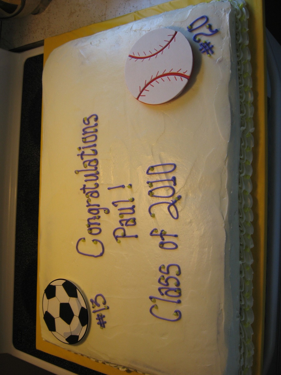 Full sheet cake for a friend's son. Cake half chocolate and half white with buttercream icing. Balls are wood.