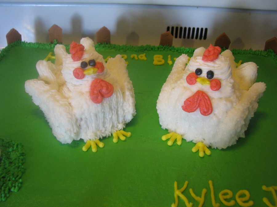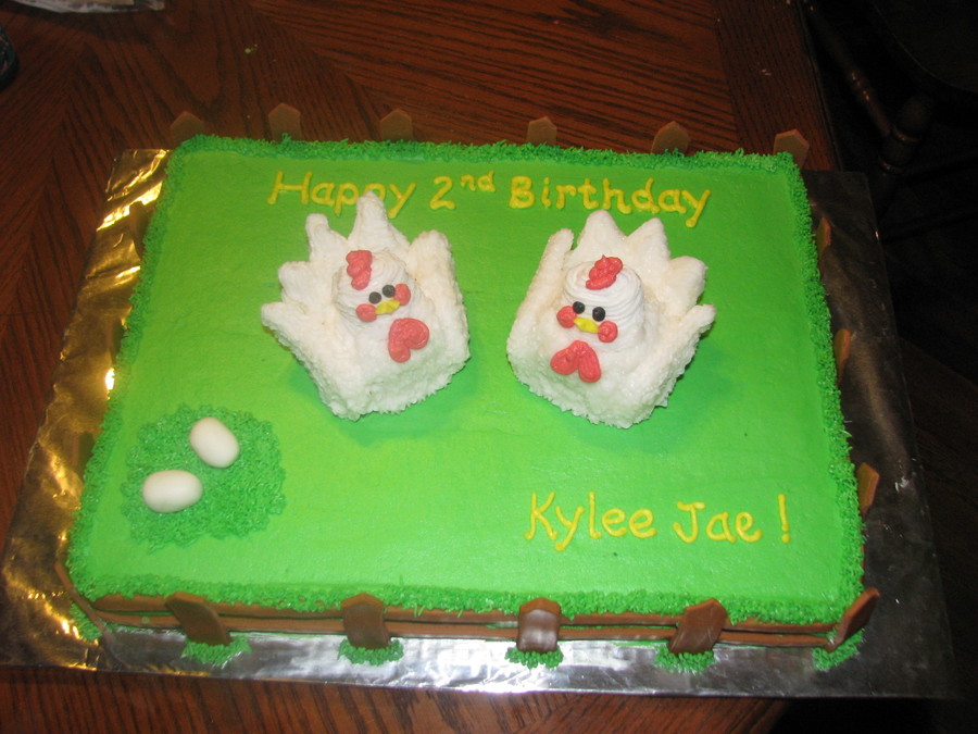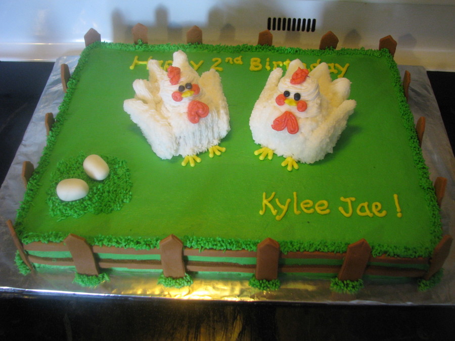 I had a last minute request for a 2 year old birthday girl that wanted a chicken on her cake LOL I guess her grandpa just bought chickens and she is totally obsessed with them. I didn't want to do just a sheet cake with a chicken drawn on it so this is what I came up with. It was also my first real attempt at working with fondant LOL Also my 1st picture to post on here :o)