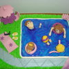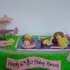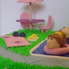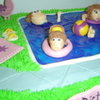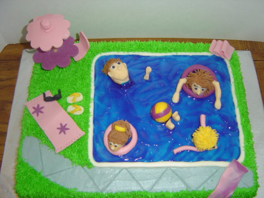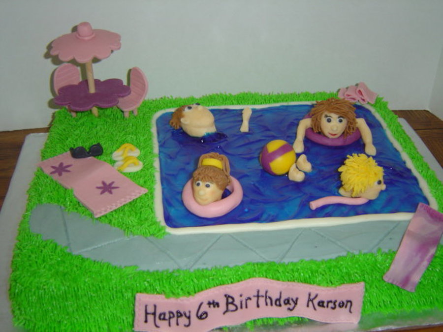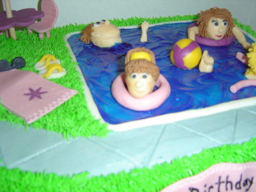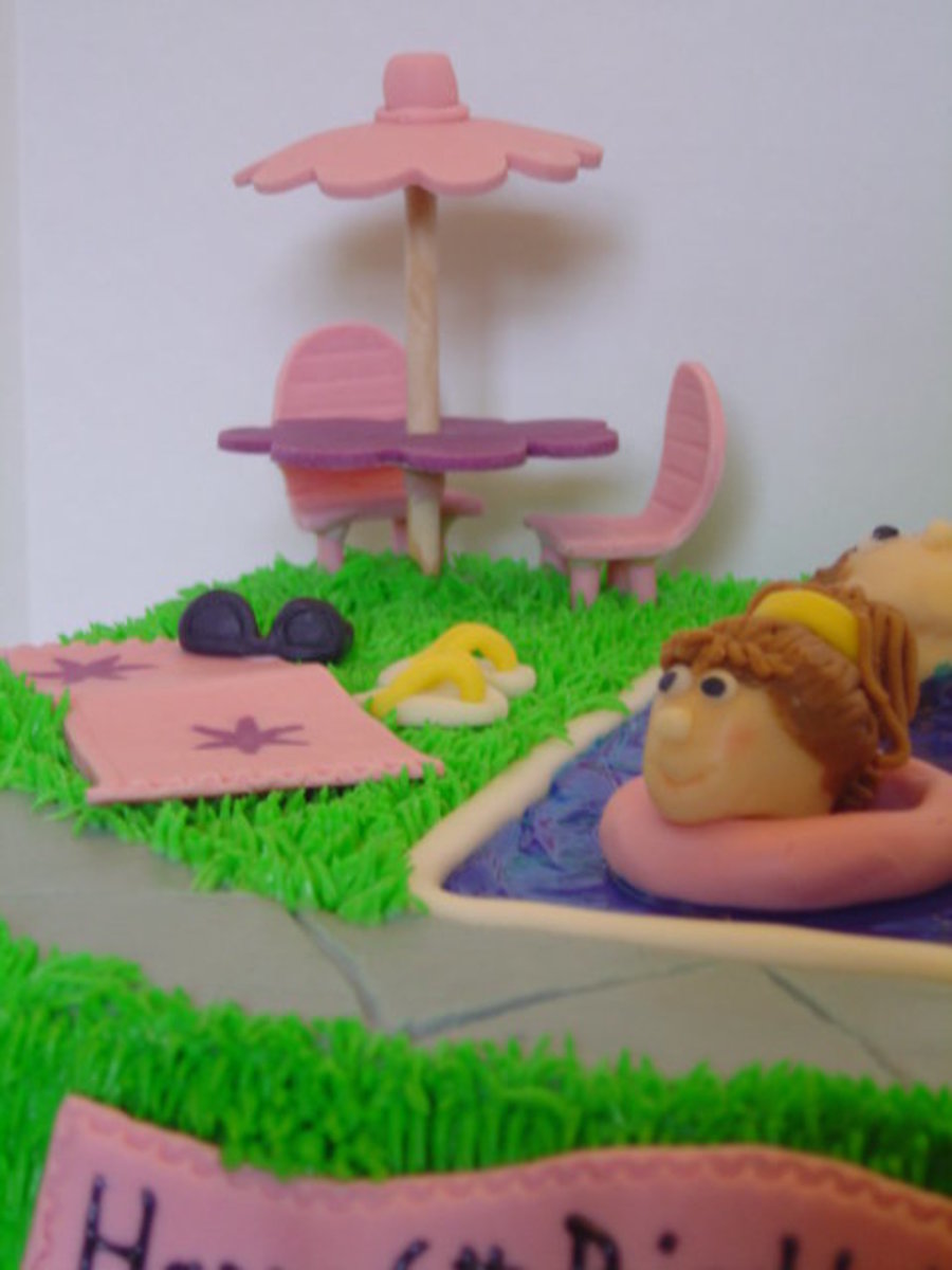 Pool Party birhtday for a real girly girl. Favorite color pink!! Yellow cake iced with buttercream. The sidewalk is fondant, the people are made out of modeling chocolate as well as all the little accessories like floats, towels, sandals, glasses and even the patio furniture.
