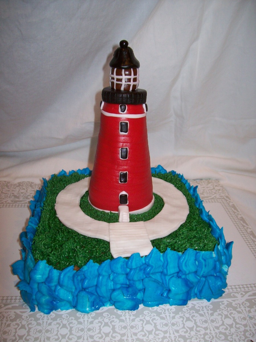 This is the Ponce De Leon Lighthouse. I made this cake for my mom who had visited the actual lighthouse in FL the year before. Lighthouse made out of fondant on top of a square cake covered in butterbream.