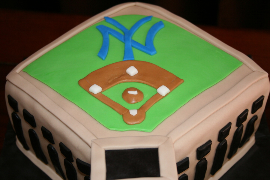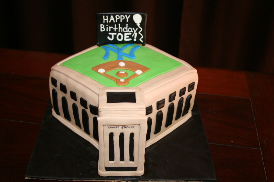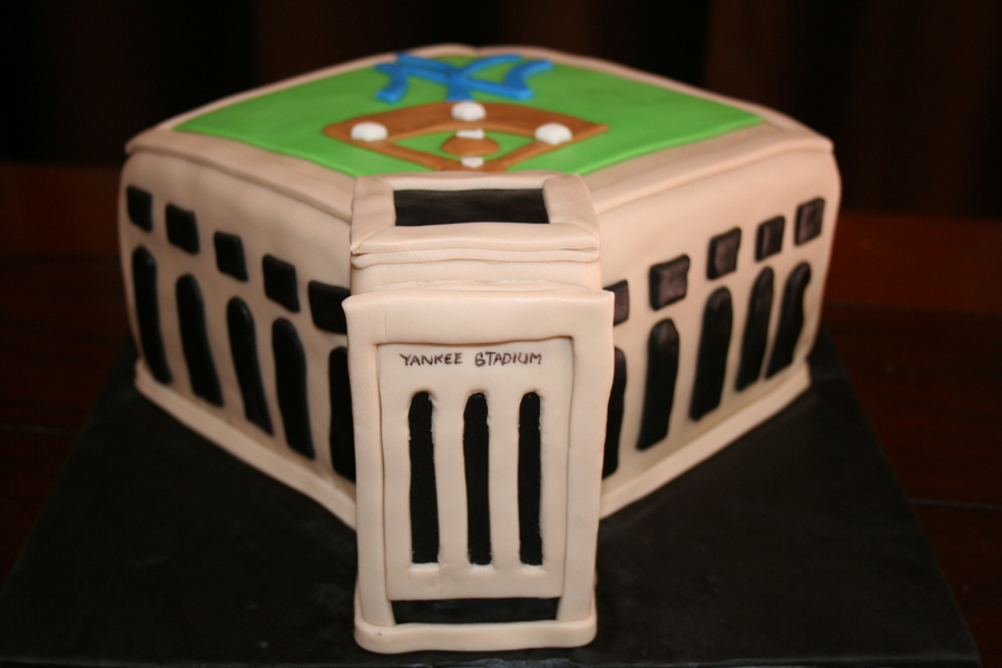 I made this for a borthday cake for a Yankee fan. They requested marble cake, and a representation of Yankee Stadium. They wanted the birthday boy's name on the "Jumbotron". All fondant covered.