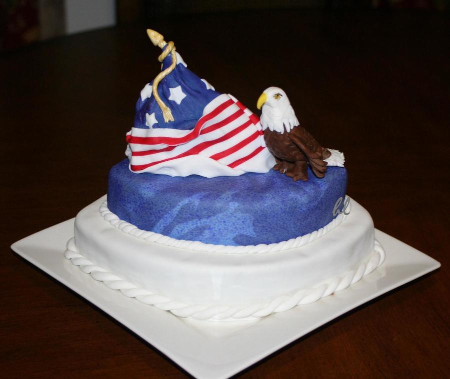 2-layers chocolate cake are stacked and carved in different sizes. The flag is a carved triangle shape of madeira cake. Decorations are fondant. Happy 4th of July! and thanks for looking.